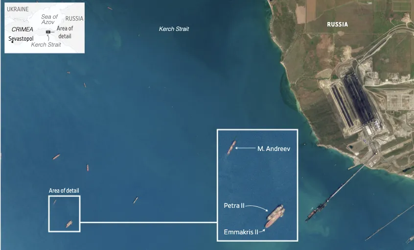 14 червня дані відстеження суден та супутникові зображення показали, що кораблі "М. Андрєєв", Emmakris II та Petra II все ще знаходилися поблизу Керченської протоки. За даними української розвідки, "М. Андрєєв" заздалегідь був завантажений ячменем у порту Севастополя. Навантаження тривало і 15 червня.