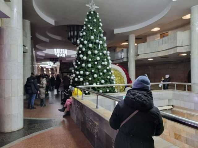 На центральній станції харківської підземки 6 грудня встановили святкову ялинку. Різдвяне дерево вже прикрасили гірляндами та сріблястими кулями.
