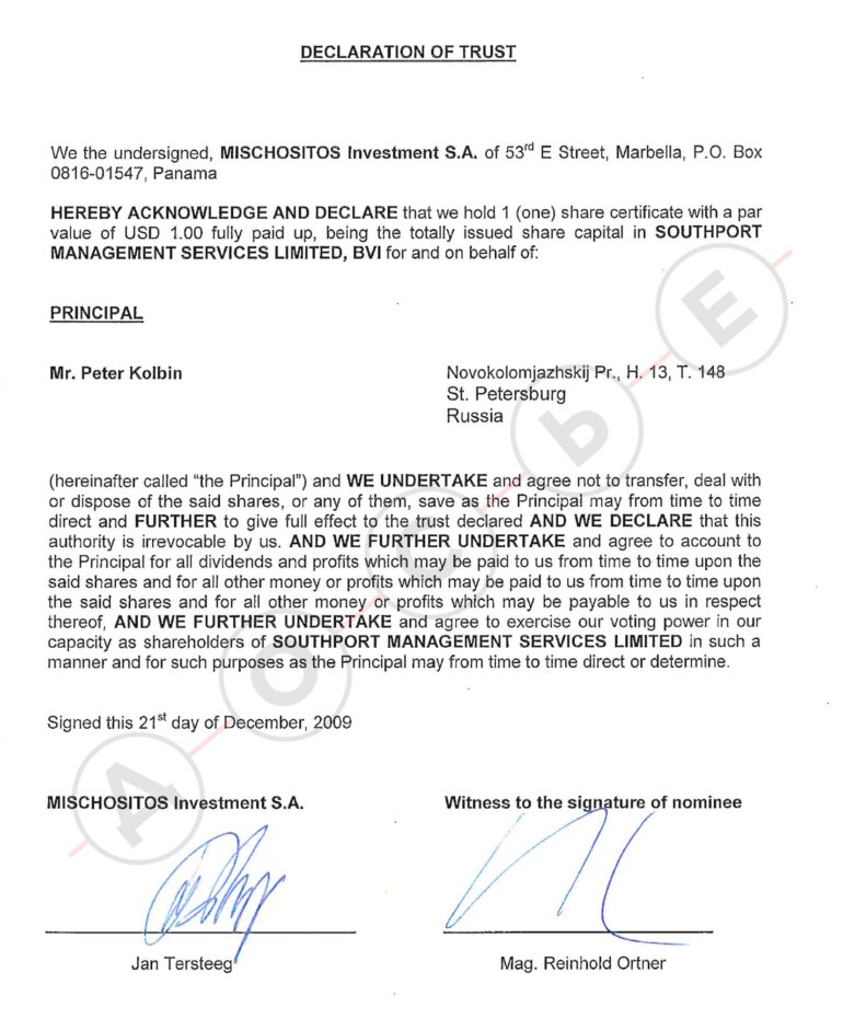 Три з чотирьох офшорів цієї угоди належать одній компанії: фірмами Kaine Enterprises Ltd , Daisha Management Ltd і Firesteed Services Ltd володіє панамська юрособа Mischositos Investment SA (це стало відомо з витоку документів панамського реєстратора Mossack Fonseca). Цій же фірмі належить і одна з компаній, через яку з Кіпру виводилися гроші за вексельною схемою — Crystalball Global Ltd. А управляє Mischositos Investment SA траст Sequoia Treuhand. У трасті не відповіли на запитання, кого вони вважають бенефіціаром панамської юрособи та решти ланцюжка офшорів.