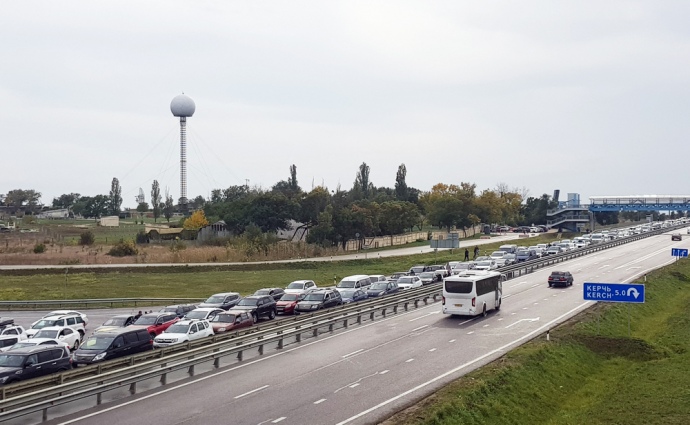 Росіяни в автомобілях чекають у черзі на перетин Кримського мосту біля Керчі, 9 жовтня 2022 року, наступного дня після вибуху. GETTY IMAGES