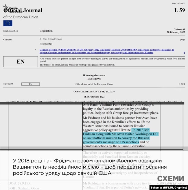 На цьому не все. У 2018 році Фрідман та Авен у ролі переговорників від РФ їздили до Вашингтону з неофіційною місією – передати повідомлення російського уряду щодо необхідності скасування санкцій США, запроваджених «для протидії агресивній політиці Росії».