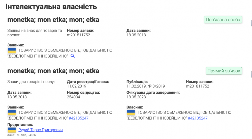 Інтелектуальну власність на бренд «Монетка» зареєстровано на ще одне ТОВ «Девінн», де теж працює Картамишев. Ми перевірили декількох його бізнес-партнерів. Один зі співзасновників Дмитро Лупеко. Це колишній перший заступник прокурора Києва та кум сумнозвісного генпрокурора Пшонки. Другий бізнесмен — колишній керівник апарату Тернопільскої ОДА епохи Януковича Юрій Желіховський.