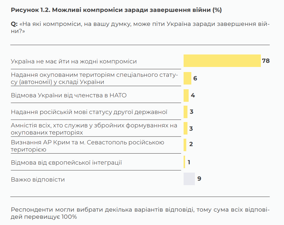 Помітно категоричною також є думка, що заради завершення війни Україна не повинна йти на жодні компроміси, ані щодо втрати територій, ані щодо членства в НАТО, ані щодо членства в ЄС, ані щодо статусу російської мови.