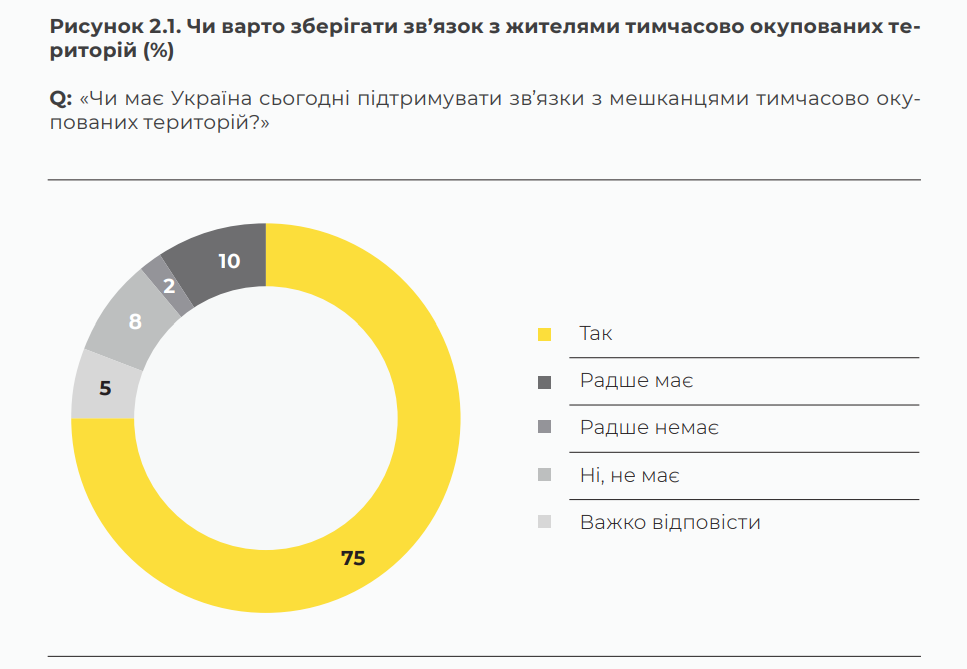 85% вважають, що варто зберігати зв’язок із жителями окупованих територій. Розподіл на це запитання майже однаковий в різних соціально-демографічних групах учасників опитування.