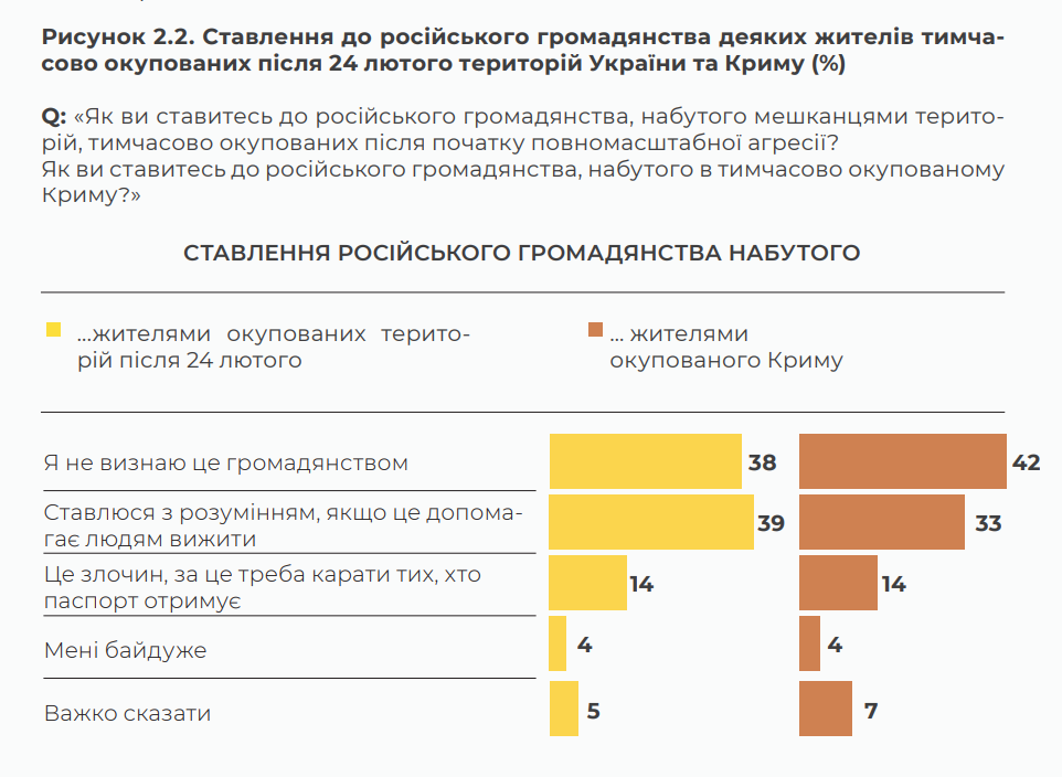 Водночас певна кількість опитаних (14%) вважає це злочином, за який має наставати покарання. Зокрема, так сприймається отримання громадянства РФ як жителями територій, що були тимчасово окуповані після 24 лютого 2022 року, так і жителями тимчасово окупованого в 2014 році Криму.