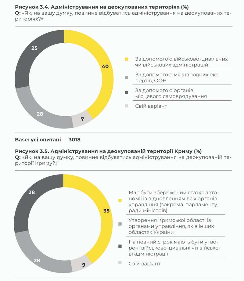 Соціологи виявили різні думки щодо найкращих методів адміністрування на деокупованих територіях. Найбільш поширеним вибором респондентів є керування за допомогою військово-цивільних або військових адміністрацій. Утім, стосовно адміністрування у визволеному Криму думки розділились. Трохи більше голосів за збереження півостровом статусу автономії.