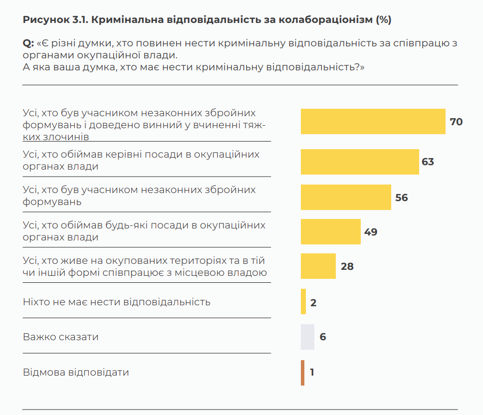 Дослідження показало високий запит суспільства на відповідальність за відкритий колабораціонізм. Передусім це стосується комбатантів та співробітників, особливо керівників органів окупаційної влади.