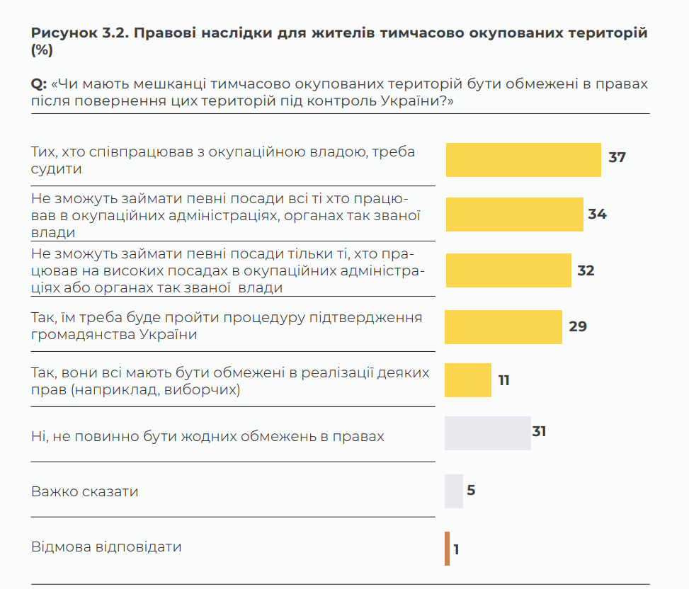 Крім цього, доволі популярною є думка, що явні колаборанти мають пройти процедуру підтвердження громадянства України. Проте дещо іншу думку висловлює майже третина опитаних: жодного обмеження прав для цих людей не повинно бути, тому що життя в окупації саме по собі не є злочином, а отже карати за це пересічних громадян не треба.