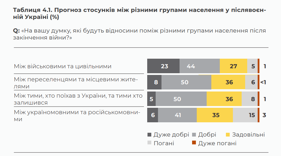 Післявоєнні конфлікти та громадське непорозуміння між різними категоріями українців не сприймаються як вірогідні сценарії. Проявом згуртованості є й помітне покращення ставлення до української влади. Певна напруга є хіба що в мовному питанні — ставленні до російськомовності в Україні.