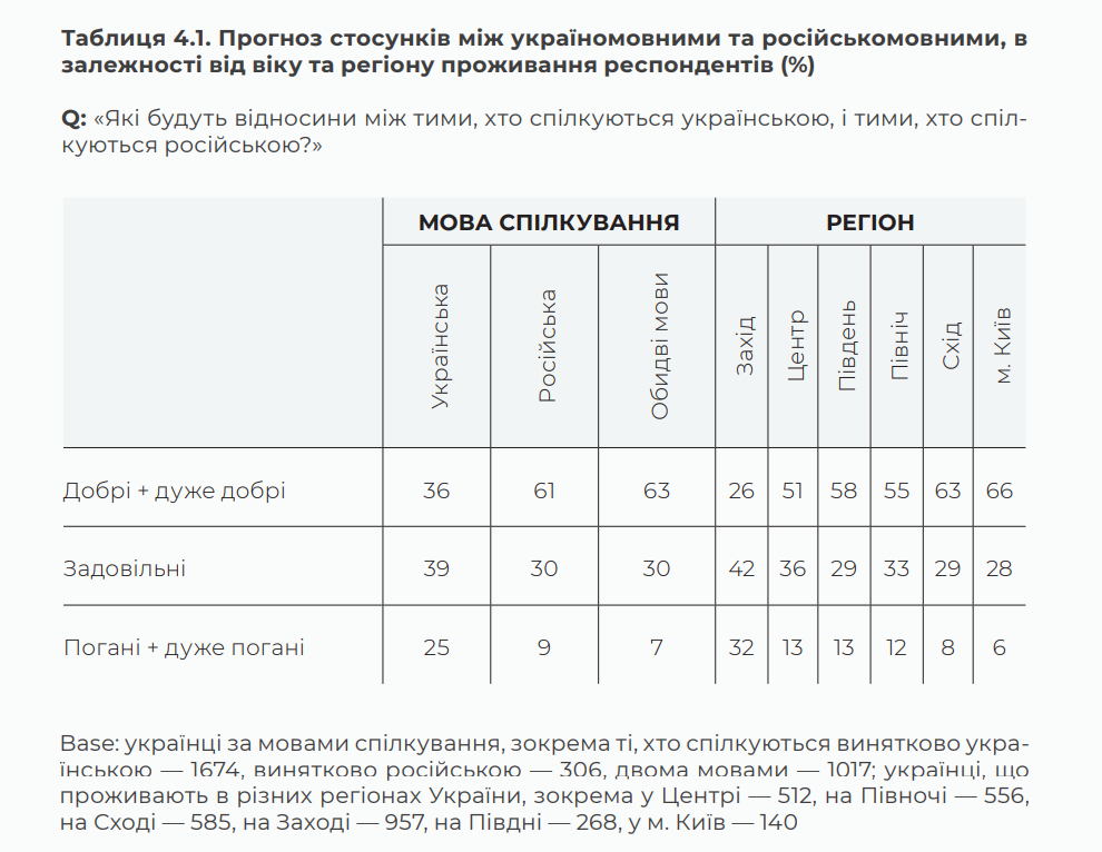 Автори дослідження вказують на найбільші побоювання щодо можливих конфліктів на мовному ґрунті. Утім, навіть в цьому випадку 82% опитаних зазначають, що стосунки між україномовними та російськомовними залишаться добрими або принаймні задовільними.