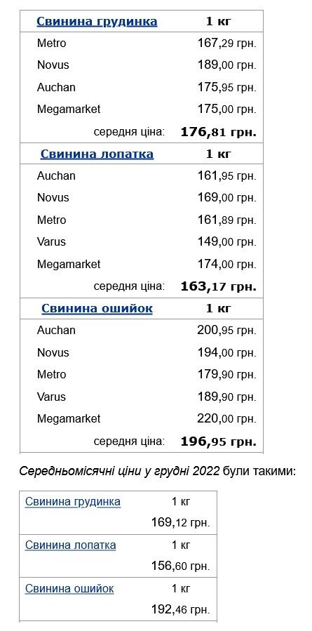 Ошийок свинячий же здорожчав на 4,49 грн. У грудні його середня ціна була 192,46 грн/кг, нині – 196,95 грн/кг. У супермаркетах цей вид м’яса продають по (за 1 кг):