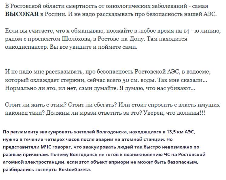 Если вы считаете, что я обманываю, поезжайте в любое время на 14 — ю линию, рядом с проспектом Шолохова, в Ростове-на-Дону. Там находится онкодиспансер. Вы все увидите и поймете сами. И не надо мне рассказывать, про безопасность Ростовской АЭС, в водоеме, который охлаждает стержни, сейчас всего 50 см. воды. Так мне сказали… Нормально ли это, ил нет, сами думайте. Я думаю, что нас убивают»… Судячи з цього крику душі ростовчанина, навряд чи «бабы еще нарожают».