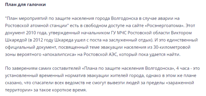Дозволю собі ще одне цитування виступу голови міської Громадської палати Ростовської області Віктора Стадникова, але у перекладі, щоб читачу було зрозуміло: «Жителі міста Волгодонська Ростовської області у разі аварії на Ростовській АЕС фактично опиняться у блокаді. Це пов’язано з транспортною доступністю. У разі аварії на атомній станції ми просто не встигнемо евакуювати мешканців міста. Ми не маємо поїздів — ми залишилися без залізничного вокзалу, без порту. Закрили аеропорт. Досі не збудовано третій міст, який обіцяли ще кілька років тому. Єдина автомобільна 25-ти километрова траса у бік Ростова у жахливому стані».