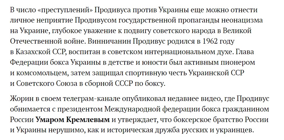 Це – лише найяскравіші епізоди з біографії спортсмена, комсомольця та відмінника Володимира Продивуса. Який насправді є відвертим бандитом (втім, його начальник із Міжнародної федерації боксу Умар Кремльов теж має не менш яскраву біографію), відданим захисником ідей «російського світу» та представником російської п’ятої колони в нашій країні.
