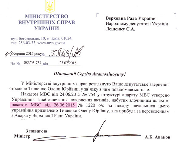 Перед цим треба влаштуватися штатним помічником депутата, а далі за домовленістю між Апаратом Верховної Ради та новим місцем роботи перейти на іншу посаду, але вже без спецперевірки. Власне кажучи, так і сказано в листі Авакова – Тищенко прибула до МВС "за переведенням з Верховної Ради України".