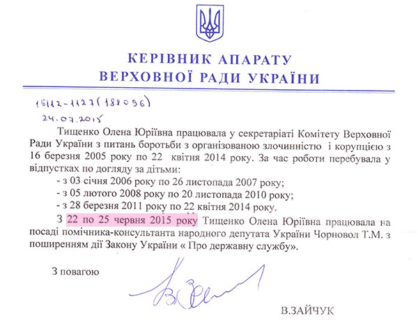 Також цікаво, що в автобіографії Тищенко стверджує, що працювала у Апараті Верховної Ради лише в 2005-2006 роках, тоді як реально – по квітень 2014 року. Неслабенька така "помилка" на вісім років!