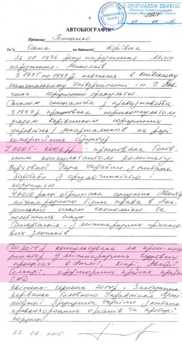 Я отримав автобіографію Тищенко, де вона власноруч зізнається, що по 2014 рік вона"консультувала як крос-координатор у міжнародних судових процесах в Англії, Кіпрі, Австрії, Голландії, офшорних країнах, країнах СНД". І саме в цей же час вона була співробітником апарату Верховної Ради, а її робоче місце було на вулиці Садова, 3-а міста Києва.