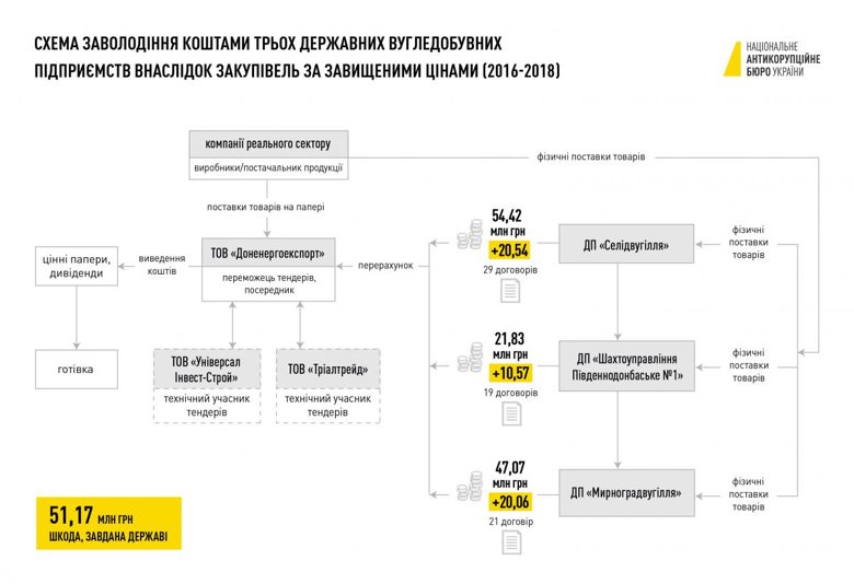 У 69 закупівлях зазначених вугледобувних підприємств договору на постачання отримувала одна компанія – ТОВ «Доненергоекспорт». При цьому йшлося про постачання найбільш затребуваних позицій: паливно-мастильні матеріали, запасні частини до гірничо-шахтного обладнання, металовироби, кабельна продукція для шахт. Однак фактично ця компанія виконувала роль посередника, перепродуючи з націнкою товар, придбаний в учасників реального сектора. Ті, у свою чергу, через спеціально створені учасниками схеми перешкоди не мали реальних шансів напряму співпрацювати з держпідприємствами.