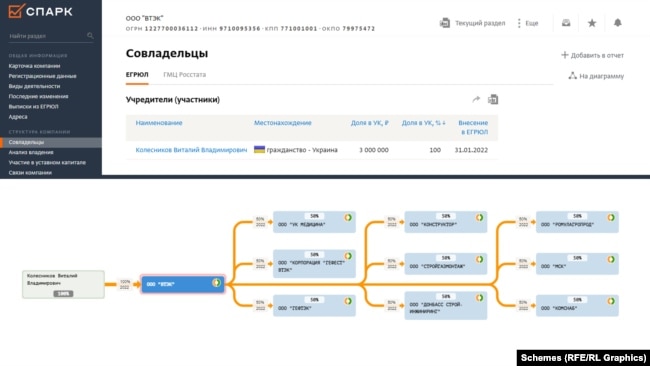 Власник «ВТЭК» – Віталій Володимирович Колесников, громадянин України. І хоча у реєстрі не вказано жодних додаткових даних щодо цієї особи, «Схеми» встановили, що це саме той Віталій Колесников, якого затримали під час передачі хабаря голові Фонду держмайна.