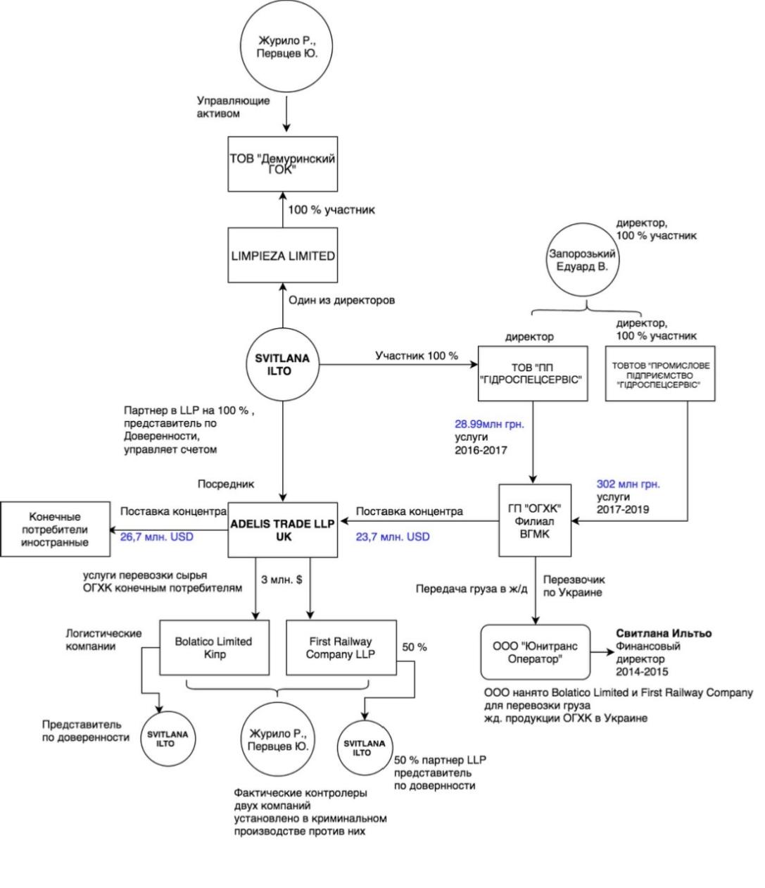 Компанії «Юнітранс Оператор», FirstRailwayCompanyLLP і BolaticoLimited надавали послуги перевезення сировини ОГХК кінцевим споживачам у зазначеній схемі, а AdelisTradeLLP – була посередником між ОГХК і кінцевими покупцями сировини. З лютого 2015 року ТОВ «Юнітранс Оператор»став монополістом залізничних перевезень ОГХК, вигравши тендери тільки за один рік на загальну суму 425,97 млн. грн. За адресою реєстрації ТОВ «Юнітранс Оператор» до 2015 року знаходився офіс ДП ОГХК.
