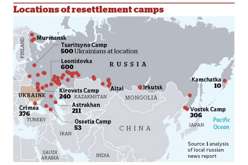 Розслідування британського видання iNews, проведене у березні 2022 року, виявило 66 таборів для примусово депортованих українців у Росії. Вони простягаються через 11 часових поясів — над Уральськими горами від Бєлгорода на заході до віддаленого півострова Камчатка і міста Владивосток на сході. Як таборові приміщення використовують санаторії, центри «патріотичного виховання», колишні дитячі табори й навіть звалища хімічної зброї.