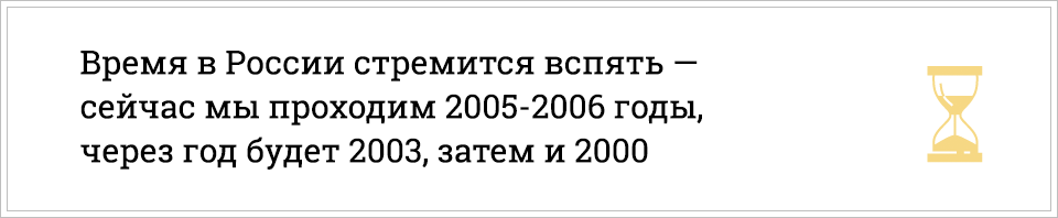 Время в России стремится вспять — сейчас мы проходим 2005–2006 годы, через год будет 2003-й, затем и 2000-й. Инфраструктура будет меняться, ассортимент в магазинах сокращаться, преступность станет выше. Через какое-то время придётся забирать с собой щётки с автомобиля, припаркованного у дома, а затем и колёса. Примерно через года два будет казаться, что пронесло. А потом уже все поймут, что происходит.