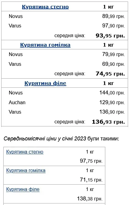 А ось куряче філе здешевшало – майже на 1,5 грн/кг: із 138,38 грн до 136,93 грн. Ціни в магазинах (за 1 кг):