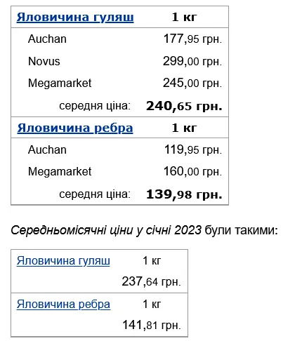 Яловичий гуляш подорожчав на 3 грн/кг – з 237,64 до 240,65 грн. Ціни в магазинах (за 1 кг):