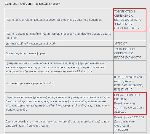 Але, за даними реєстру юросіб, як у часи директорства Губарєва, так і в часи укладання угод із "Промінвестбанком", власницею цієї компанії була мешканка Донецька Бондаренко Ніна Іванівна. Ця ж жінка була власницею фірми "Рекком", про що також свідчить реєстр юросіб.