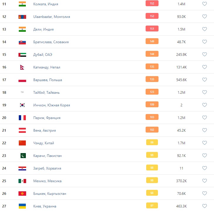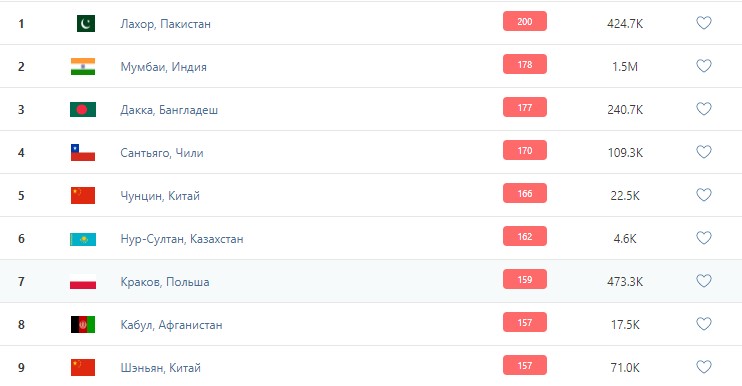 За даними рейтингу компанії IQAir, станом на 14:15 столиця знаходиться на 27 місці у світовому антирейтингу міст з найбільш брудною атмосферою.