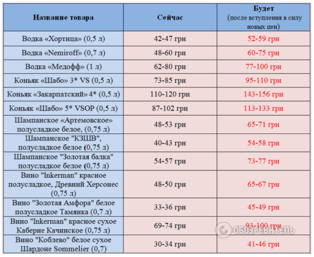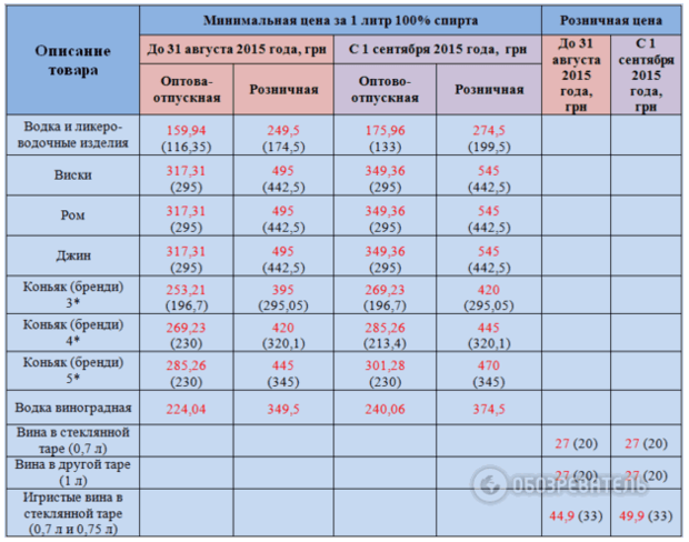 Соответственно, с 1 сентября цена самой дешевой бутылки водки повысится до 52-59 гривен. Бутылка ординарного коньяка (три звездочки), которая ранее обходилась минимум в 79 гривен, теперь подорожает до 95 гривен. Цена пятизвездочного коньяка в сентябре поднимется со 87 до 113 гривен, а самое дешевое игристое вино в бутылке 0,7 литра будет стоить 54 гривен. На остальное вино минимальная цена в сентябре поднимется в среднем до 41-46 гривен за бутылку.