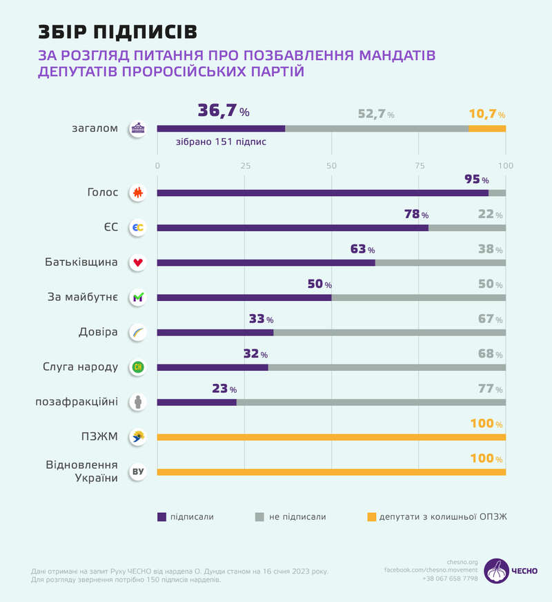 Якщо дивитися на відсоткове співвідношення, то у фракції "Слуга народу" найменша кількість підписів під цим зверненням. І це багато про що говорить.