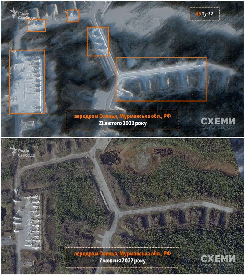 Як зазначають журналісти, порівняно зі знімками за 7 жовтня 2022 року, стратегічних бомбардувальників Ту-95 на аеродромі "Олень" у лютому 2023-го загалом побільшало на 7 одиниць. Всього на аеродромі зараз знаходиться 11 літаків Ту-95, два - Ту-160 та два Іл-78.