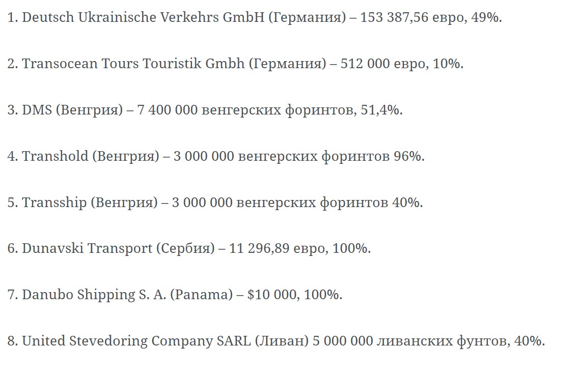 І що дуже важливо для нашої історії — УДП є співвласником чи власником восьми іноземних підприємств. Нижче їх назви, статутний капітал та частка пароплавства за даними на кінець 2019 року:
