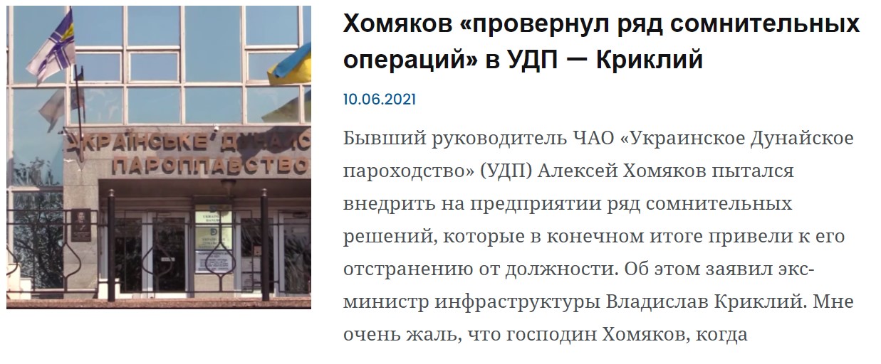 Олексій Хомяков очолював Українське Дунайське пароплавство півтора року – з листопада 2019-го до квітня 2021 року, і закінчилося його правління кримінальною справою за статтею 111 КК України (Державна зрада).