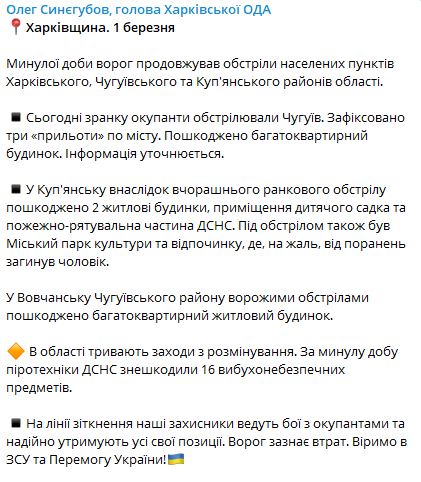 Вранці 1 березня війська РФ обстріляли Чугуїв Харківської області.