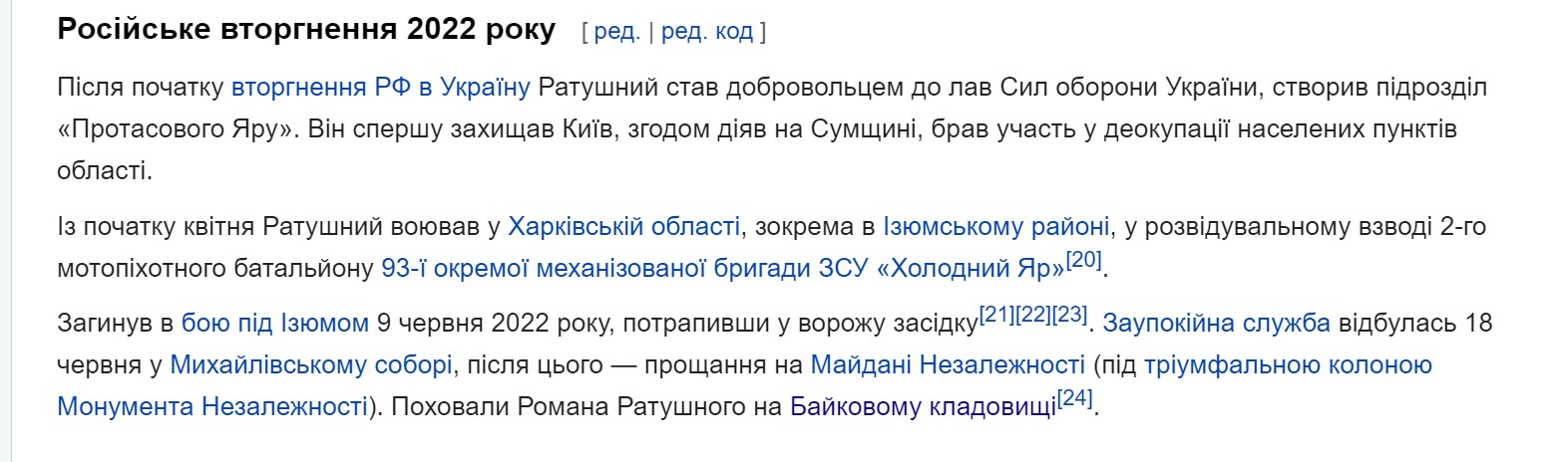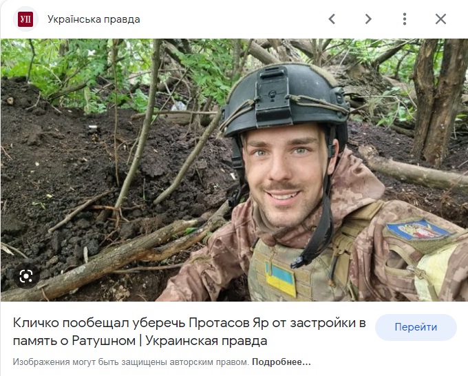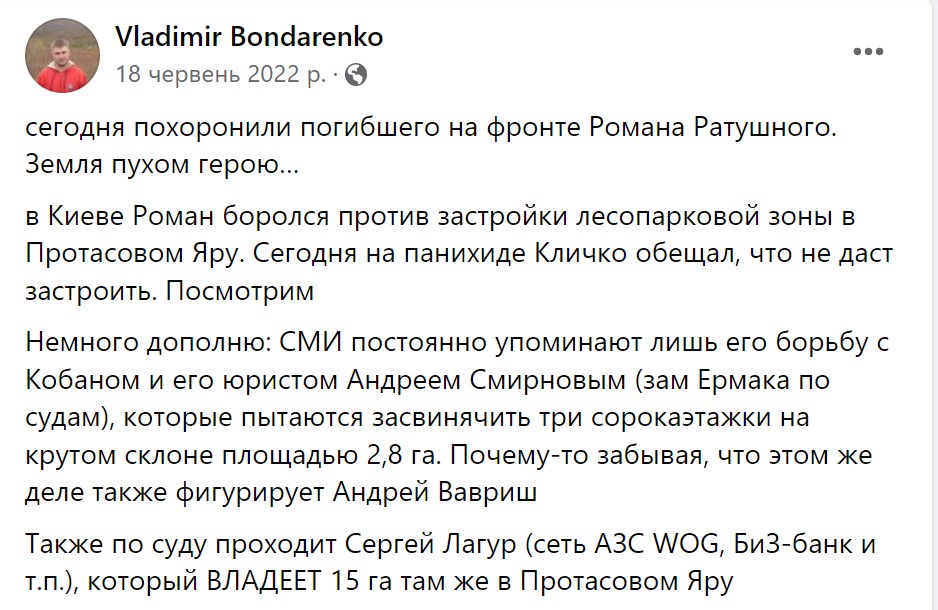 Після загибелі Ратушного на фронті Кличко публічно пообіцяв уберегти Протасів Яр від забудови.