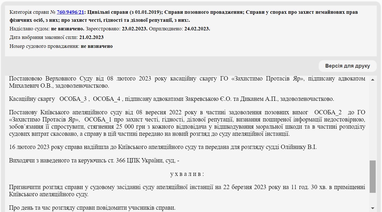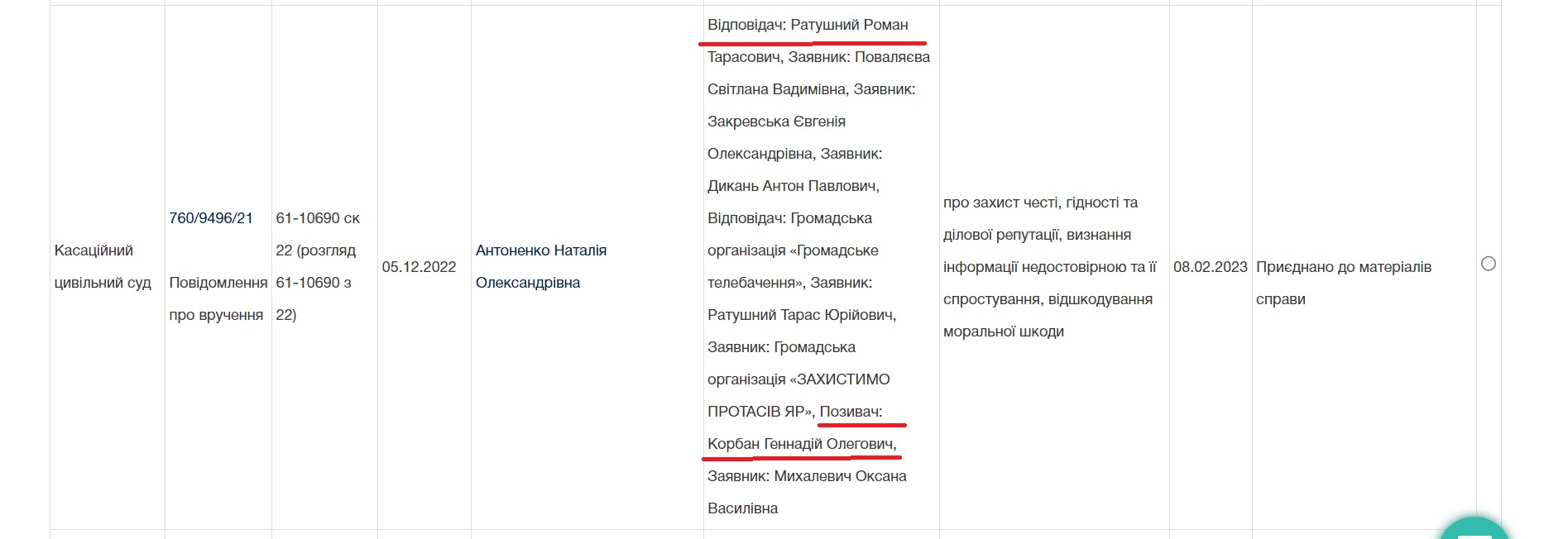 Але все це не завадило Геннадію Корбану і далі позиватися до вже загиблого Романа Ратушного. 5 грудня 2022 року Касаційний цивільний суд призначив справу про розгляд позову Геннадія Корбана до Романа Ратушного на розгляд на 08 лютого 2023 року: