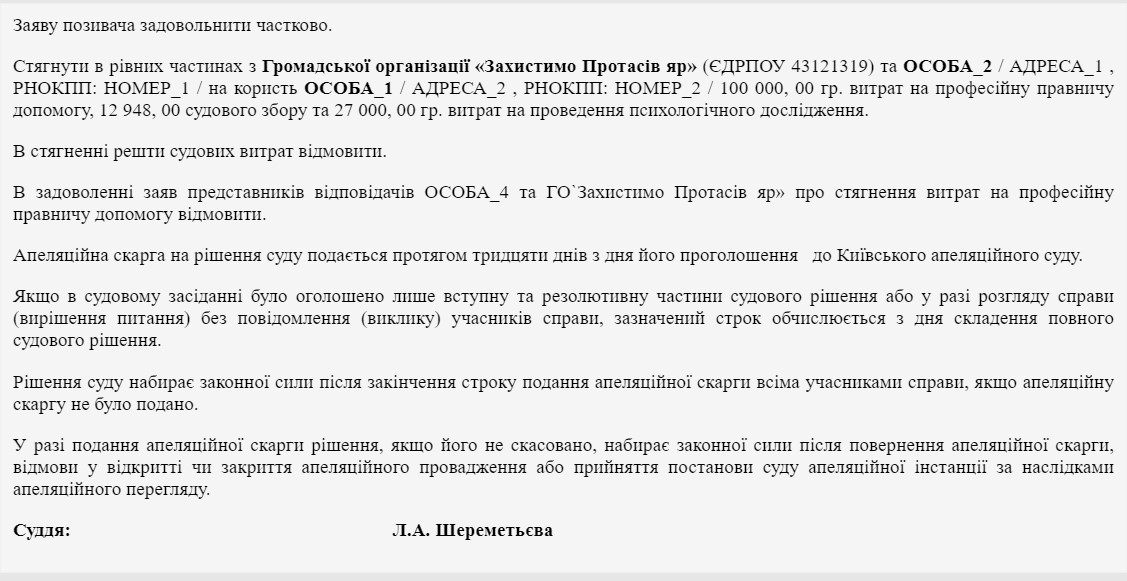 Що ж хоче Геннадій Корбан? А хоче він «Стягнути в рівних частинах з Громадської організації «Захистимо Протасів яр» (ЄДРПОУ 43121319) та Ратушного Романа Тарасовича на користь Корбана Геннадія Олеговича 100 000, 00 грн. витрат на професійну юридичну допомогу, 12 948, 00 судового збору та 27 000, 00 грн. витрат на проведення психологічного дослідження»: