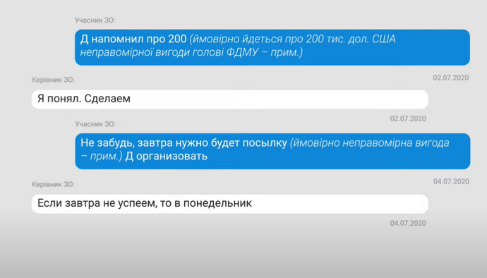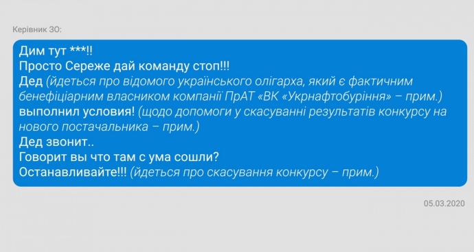 “Дід (імовірно, Коломойський – ЕП) виконав умови! Дід дзвонить. Каже: “Ви що там – з глузду з’їхали? Зупиняйте конкурс”, – наводять листування учасників схеми детективи.