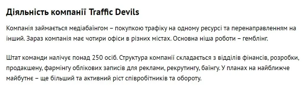 Traffic Devils – компанія у сфері медіабаїнгу, тобто нібито займається закупівлею рекламних майданчиків. Однак її діяльність у цьому напрямі стосується переважно так званого "арбітражу", тобто приведення відвідувачів на сайт замовника.