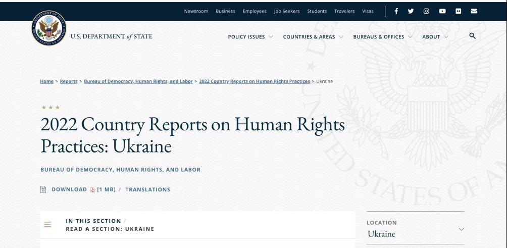 Як говориться у звіті, гарантована Конституцією свобода слова та преси була обмежена рішенням української влади після почату повномасштабного вторгнення Росії. З того часу влада блокувала видання, які вважає загрозою національній безпеці. Але до цього списку потрапили також опозиційні телеканали, які до багато років працюють в Україні. Державний департамент також вважає недостатнім розслідування випадків нападів на українських журналістів.
