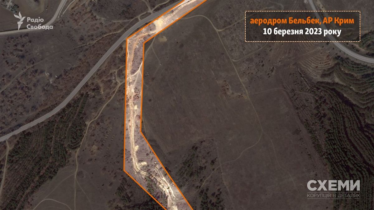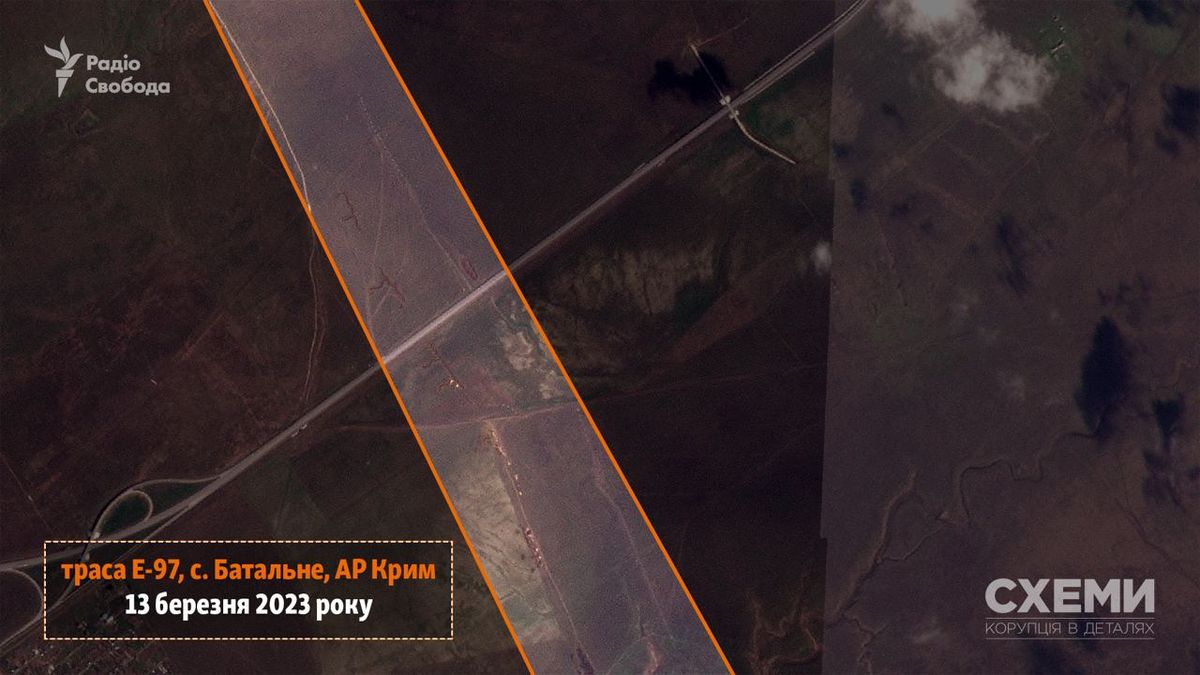 Оборонними спорудами росіяни фактично відрізають Керченський острів. Біля траси Е-97 за селом Батальне видно нові окопи та капоніри для техніки.