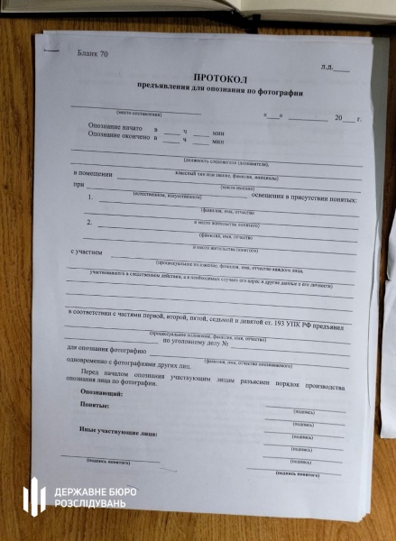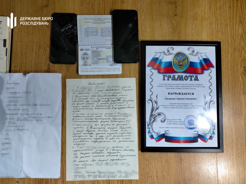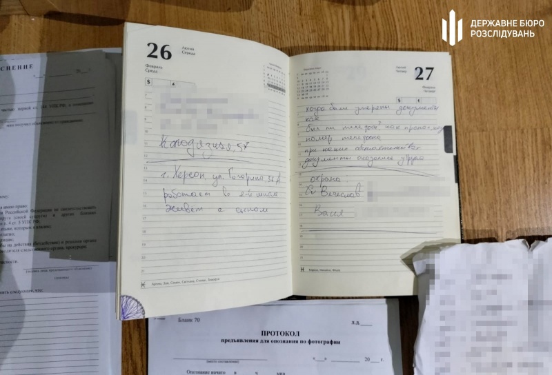 Під час проведення обшуків за місцем проживання підозрюваного працівники ДБР у взаємодії з СБУ вилучили документи, які підтверджують його службу на росіян. Зокрема, бланки протоколів та відібрання пояснень, складені відповідно до кримінального законодавства РФ, записи щодо місцеперебування та політичних поглядів місцевих жителів.
