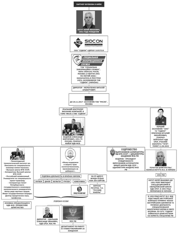 Генерал КДБ СРСР Прилуков Віталій Михайлович, помер в червні 2022 року, колишній бенефіціар ТОВ «Спеціальна інформаційна служба» (Москва, Росія). Дочірнє підприємство в Києві – ТОВ «СІДКОН», директор Когут Юрій Іванович.