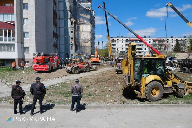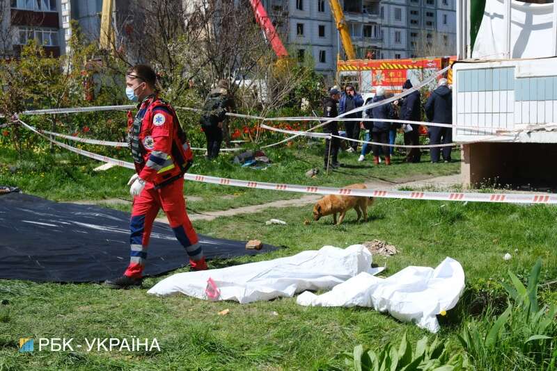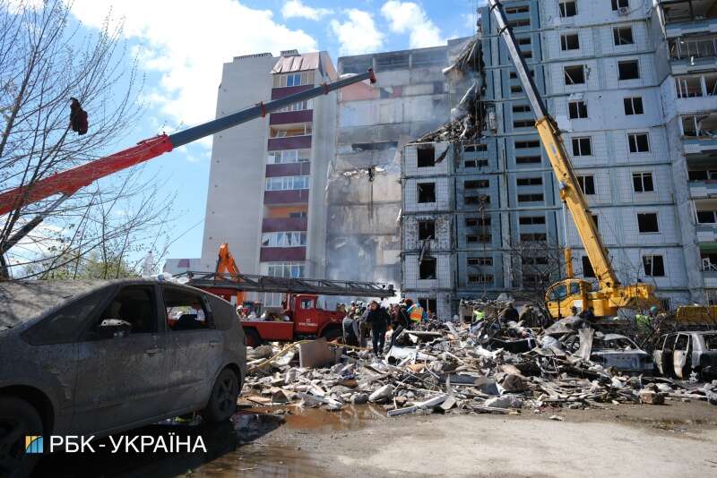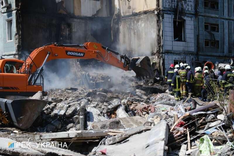 Кореспондент РБК-Україна повідомляє, що рятувальники все ще розбирають завали пошкодженого будинку. Російська ракета зруйнувала практично цілий під’їзд. Залишки завалів продовжують горіти. Крім того, вибухом повибивало вікна в сусідніх будинках.