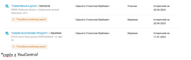 Це - не єдиний об’єкт, який пов’язує Серьогіна з високопосадовцями часів Януковича. З 2013 року чинний претендент на керівника АРМА Станіслав Серьогін очолював ТОВ «Новий ексклюзив продукт», який раніше був зареєстрований з «Томилівською дачею» за однією адресою та мав спільний номер телефону.