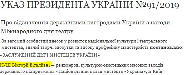 Варто зазначити, що ще за правління Порошенка українку Вікторію Кохану було нагороджено за значний особистий внесок у розвиток національної культури та театрального мистецтва.