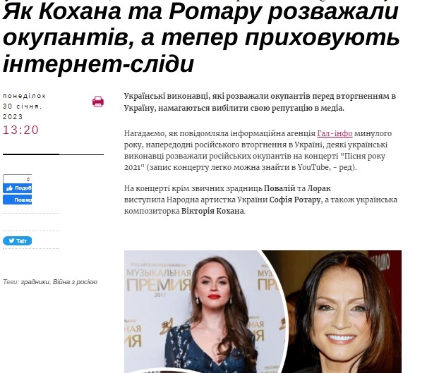 Примітно, що після відповідних публікацій про скандальні виступи заради забави окупантів у відомих українських ЗМІ Вікторія Кохана та інші персонажі, озвучені у статтях, почали скаржитися до редакції Google на ці публікації.