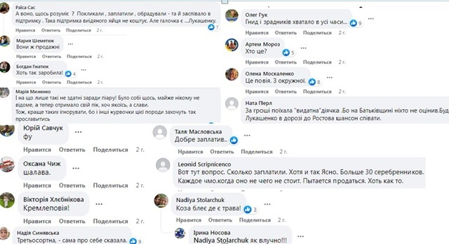 Ось, що писали тоді в соцмережах: «Це повія з окружної», «Коза мекає, де є трава», «намагається продатись», «кремлеповія», «хоч так заробила», «гнид і зрадників вистачало в усі часи», « а воно хоч щось розуміє?», «за гроші поїхала «видатна» діячка»...